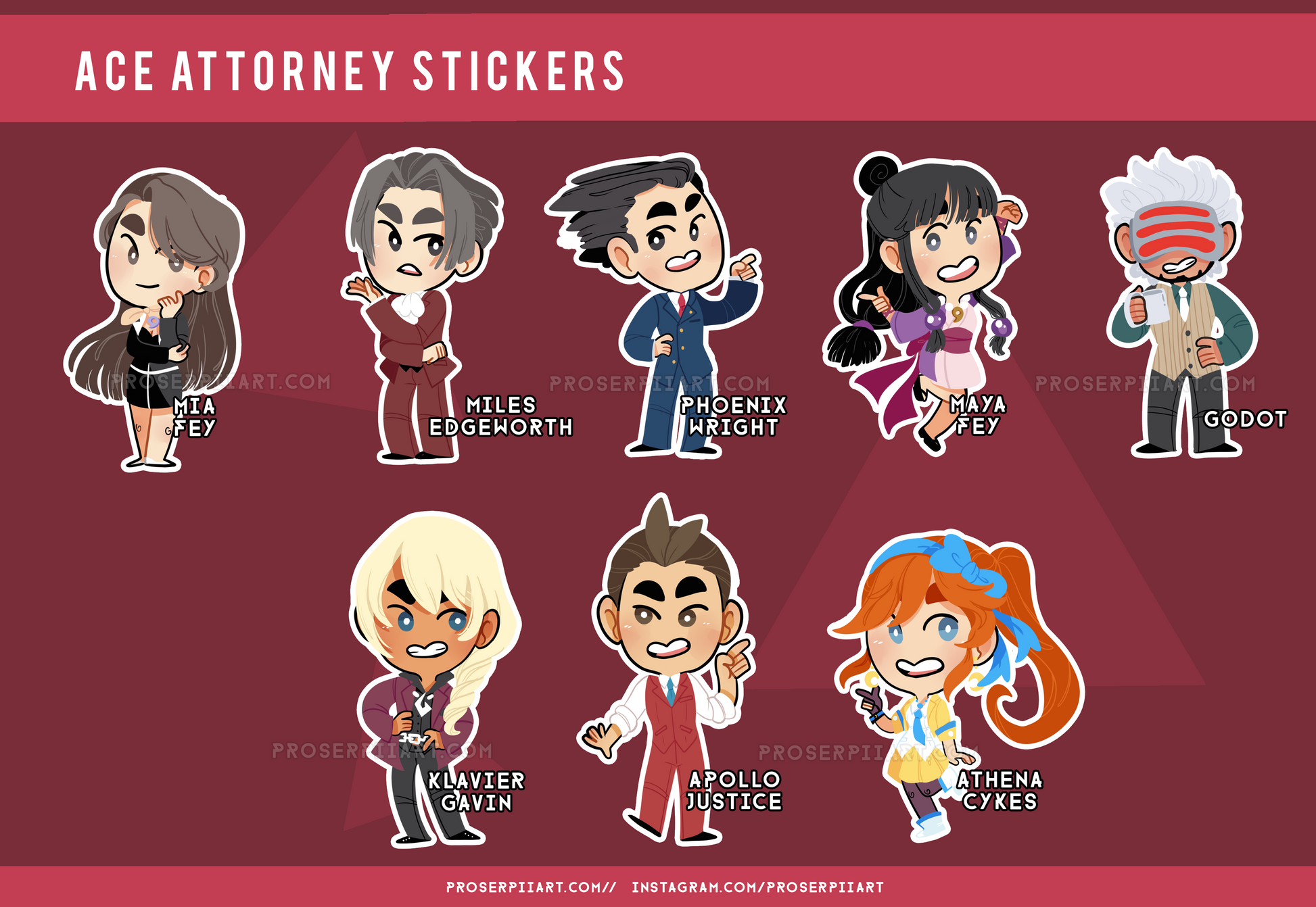 Stickers based on Ace Attorney! Perfectly suited for laptops, game consoles, notebooks and journals, or any flat or curved surface at all. They're not entirely water-proof so only suitable for indoor use, but they can handle a little wear and tear.