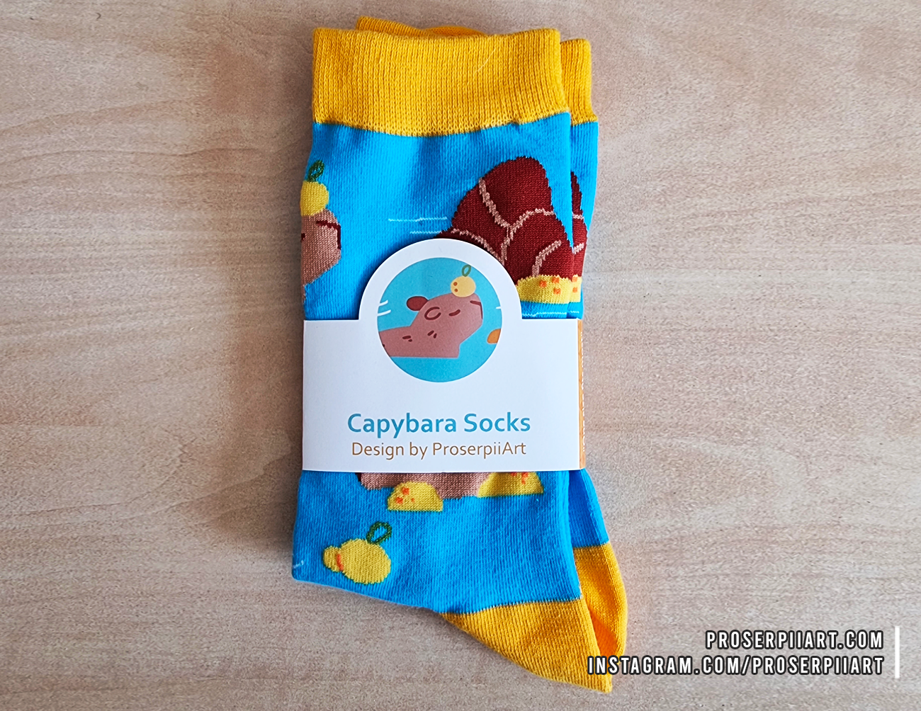 These cute colourful socks feature a plethora of chill capybaras bathing with their favourite treats, truly just vibing. There isn't a thought in their heads or a single worry in their lives. Look upon these socks and wish your life was this problem-free and filled with tangerines.