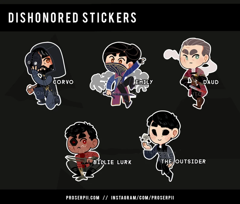 Dishonored stickers for the stylish heretic! Stick these on anything you own to infuse them with a little bit of The Outsider's power.