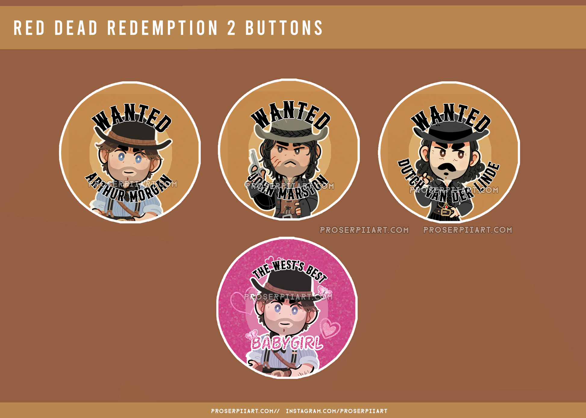 Buttons/Badges inspired by the game Red Dead Redemption 2! Show your love for the game with a button of Arthur Morgan, John Marshton, or Dutch Van Der Lineda <3