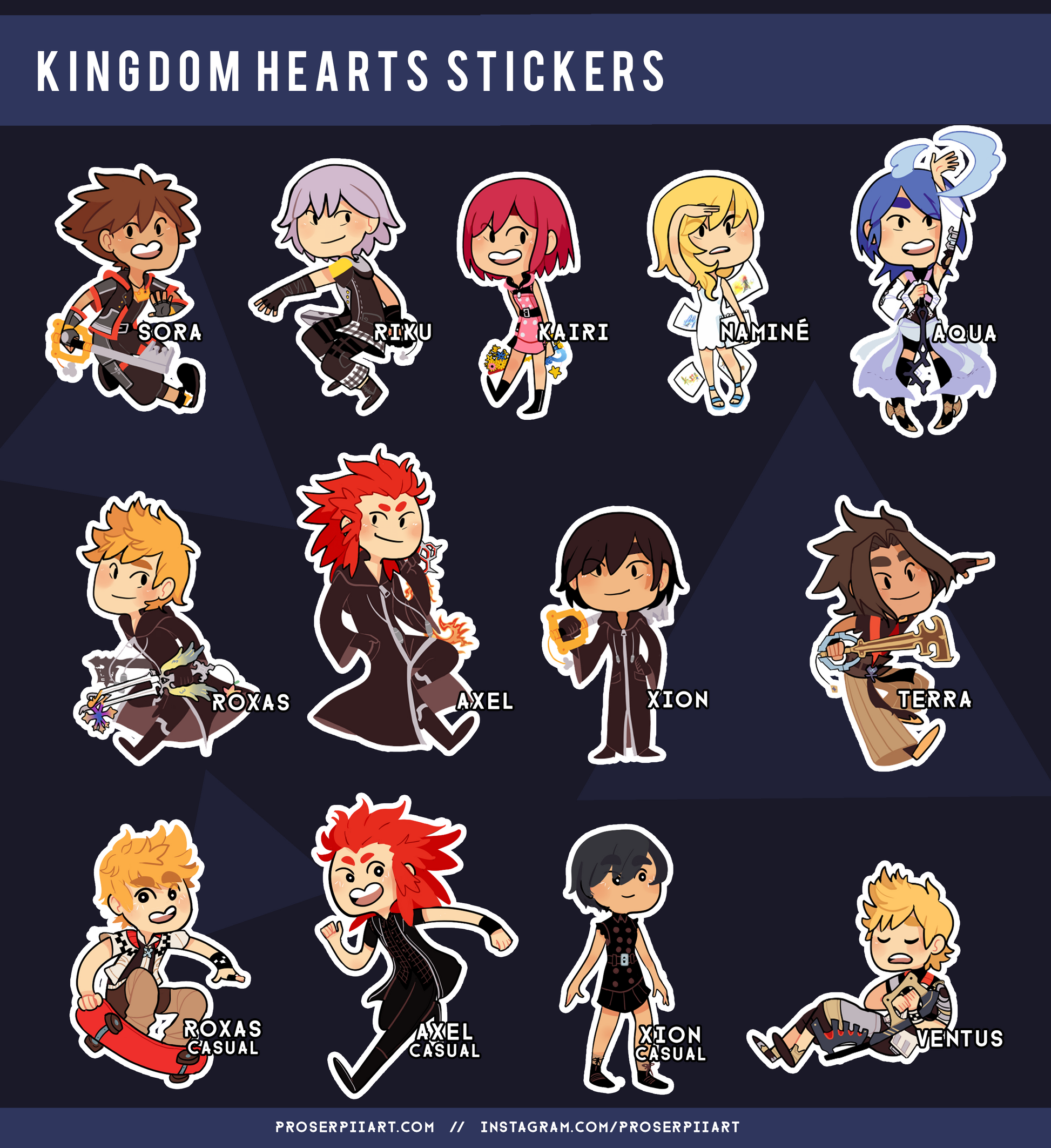 Kingdom Hearts stickers featuring your favourite keyblade warriors (+Namine)! Spruce up your belongings with these cute little warriors just trying to save all the worlds. These stickers are printed on paper sticker stock (not water-proof! For indoor use only), cut by hand, and perfect for laptops, notebooks, journals, and more!