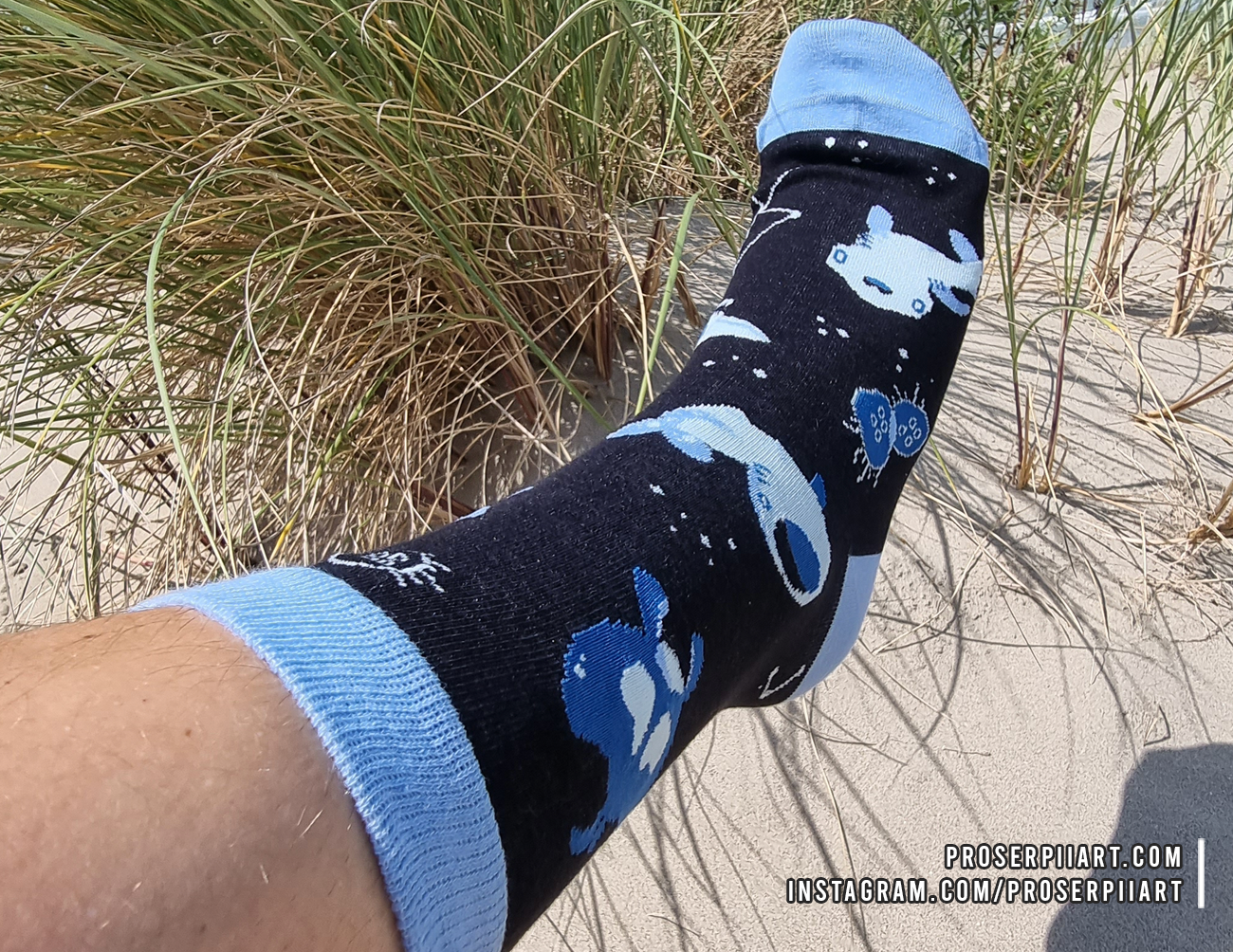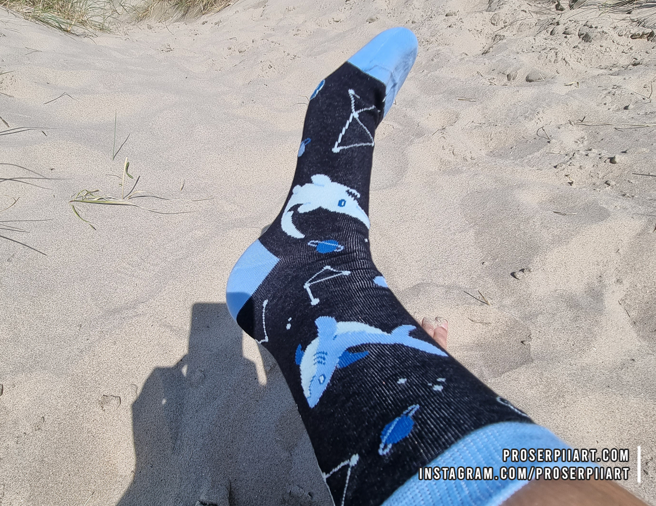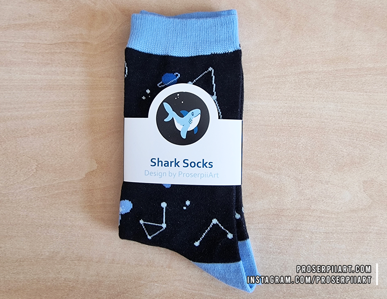 These shark socks feature a great white shark, a hammerhead shark, a whale shark, a goblin shark, and a manta ray (closely related to sharks!) alongside some moon jellies and various space themed iconography.