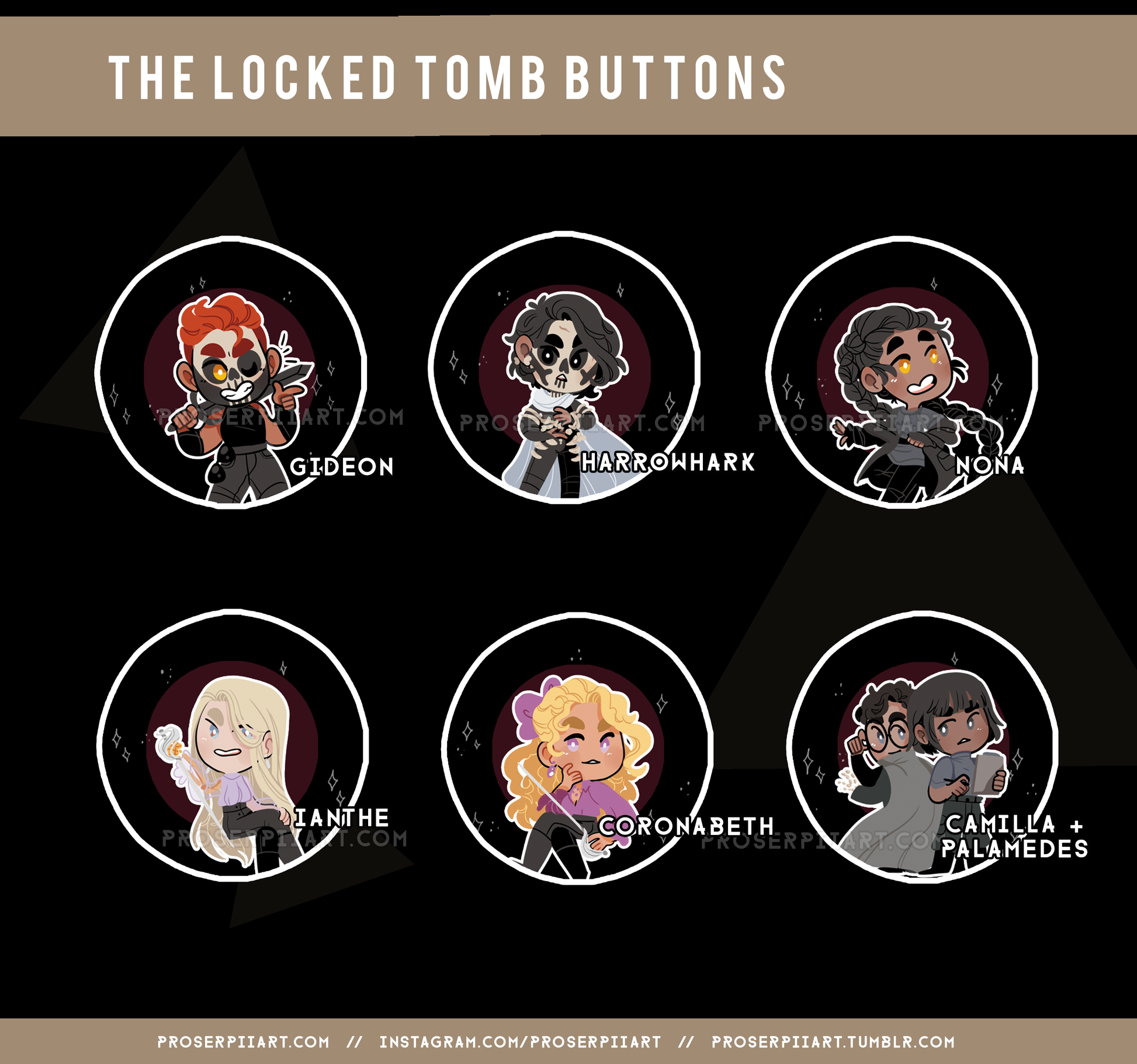 Buttons inspired by the books The Locked Tomb!
